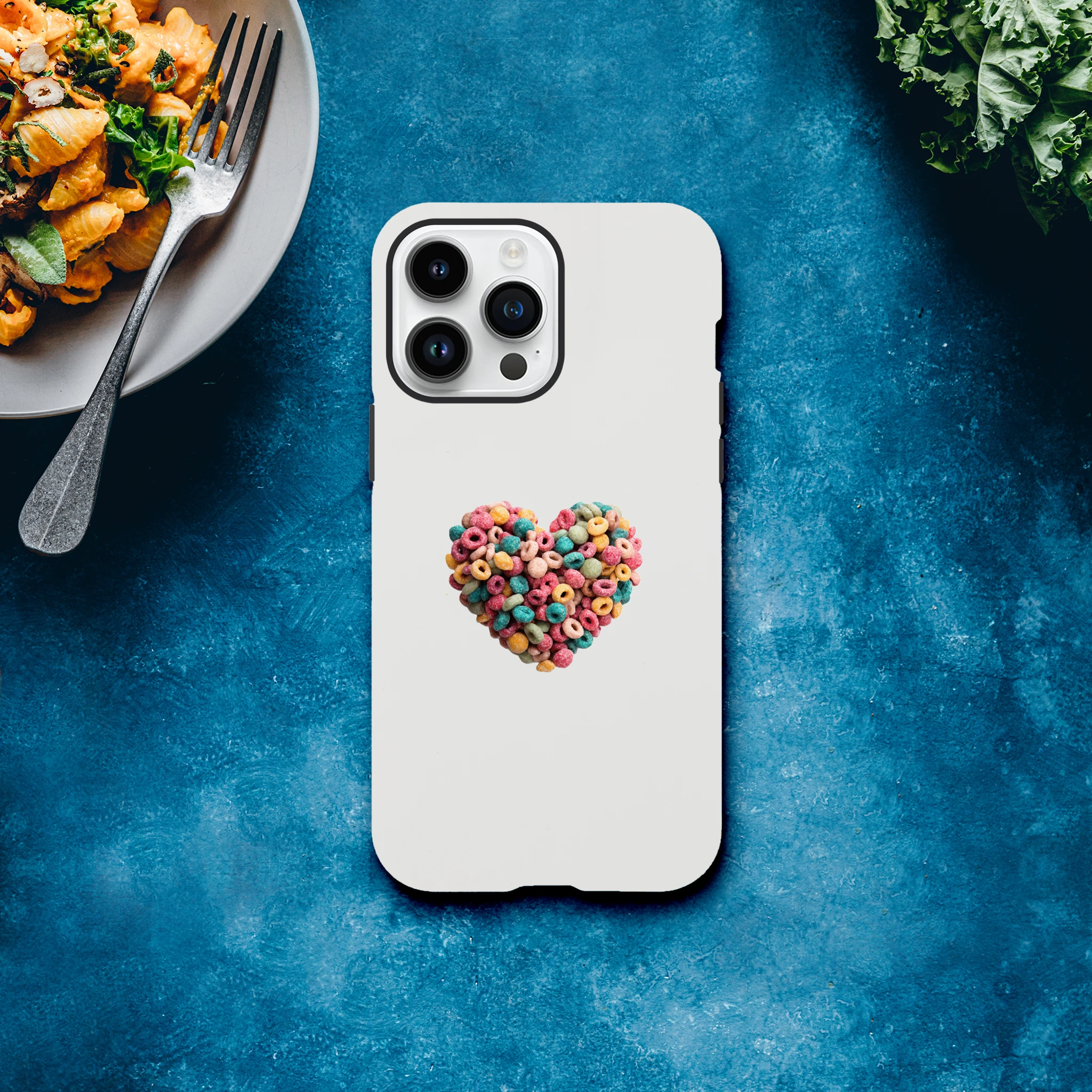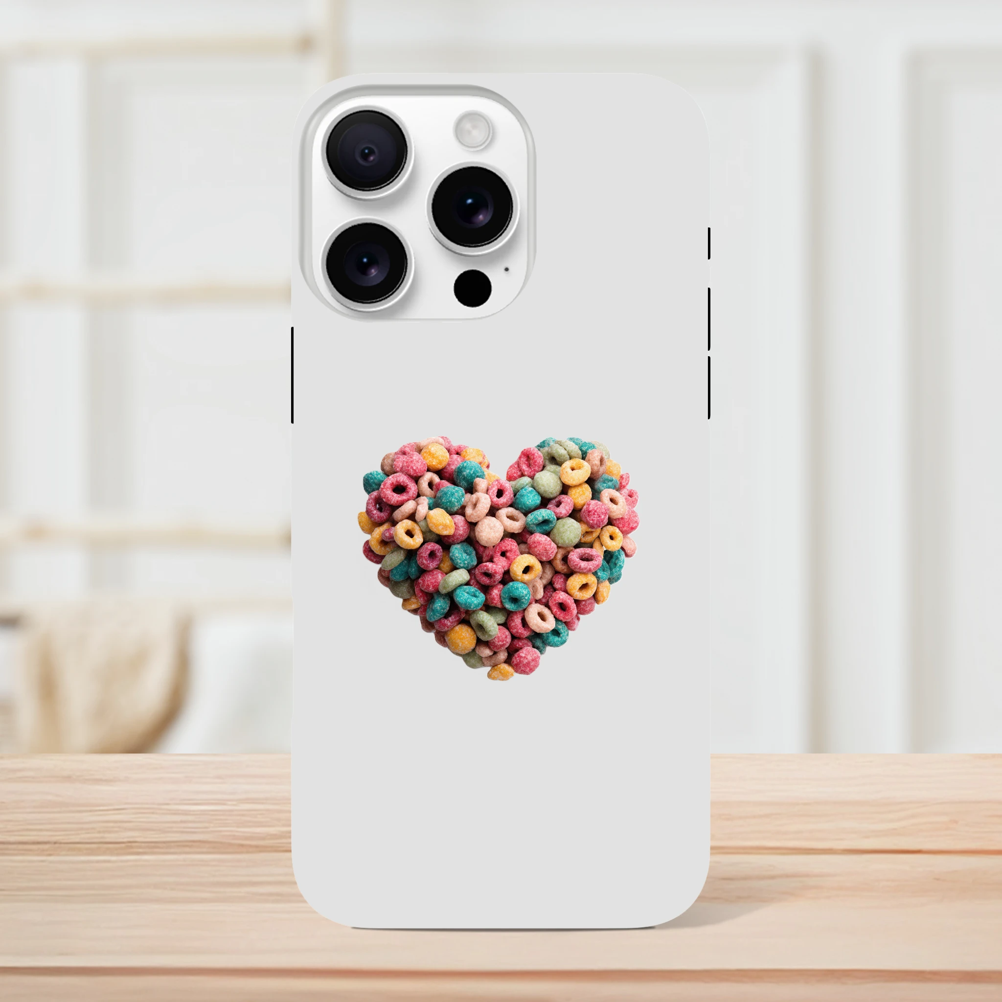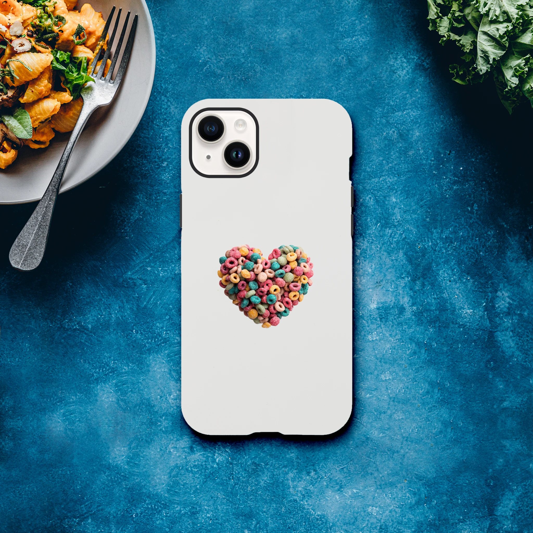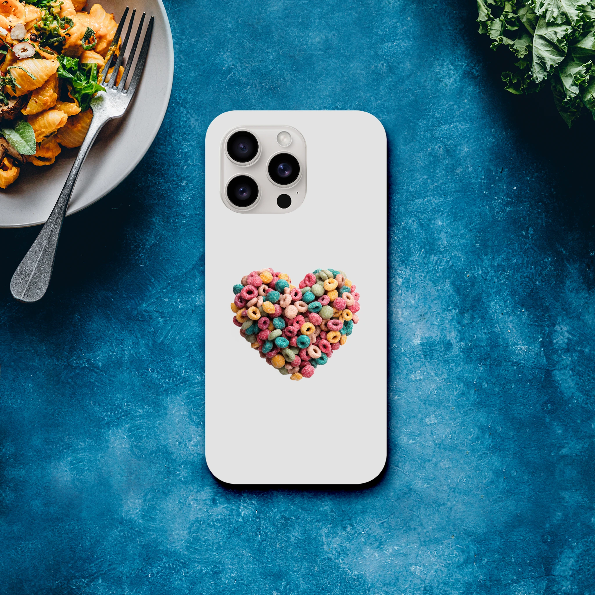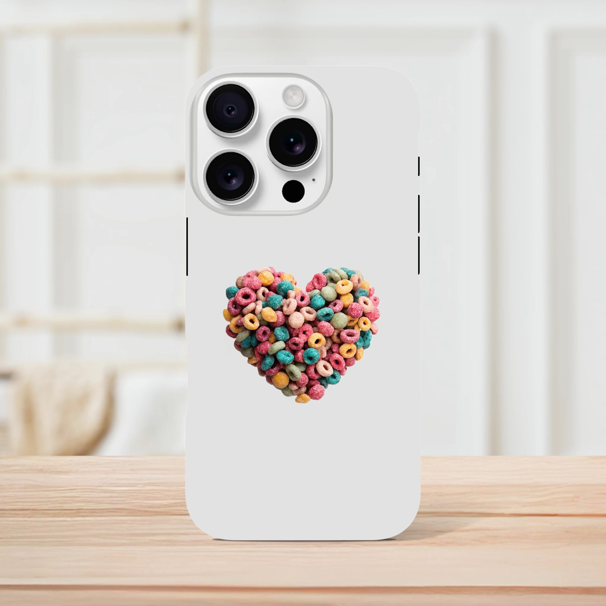 Voici la coque de protection pour iPhone «Cœur en Céréales multicolores», parce que votre téléphone mérite aussi un petit-déj’ ! Transformez chaque appel en pause sucrée et protégez votre précieux téléphone avec amour et croquant. Cette coque aussi appétissante qu’élégante fera saliver vos amis tout en gardant votre écran à l’abri. Attention : bien que séduisante, elle n'est pas comestible ! Parfaite pour les gourmands de style et ceux qui veulent garder une touche d’humour dans leur poche. Faites battre le cœur de vos notifications avec une touche d’éclat multicolore !