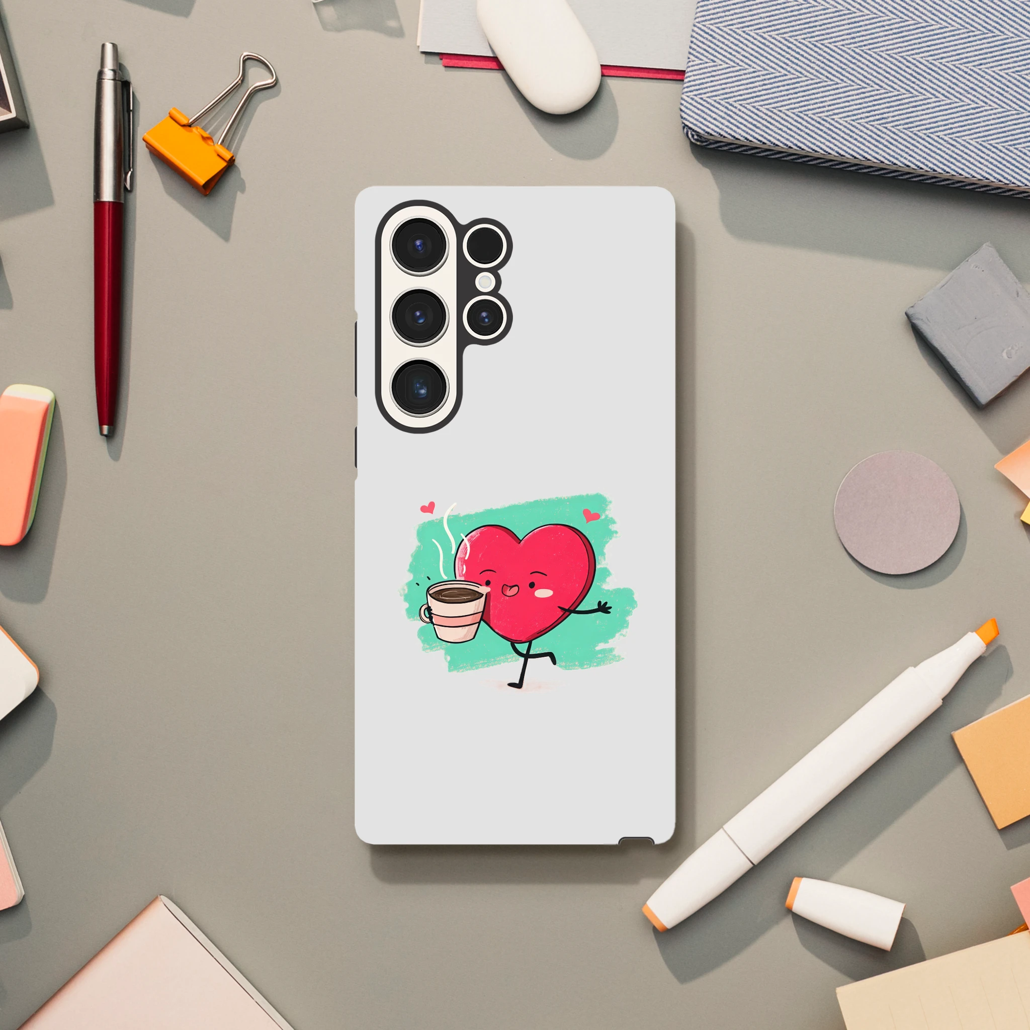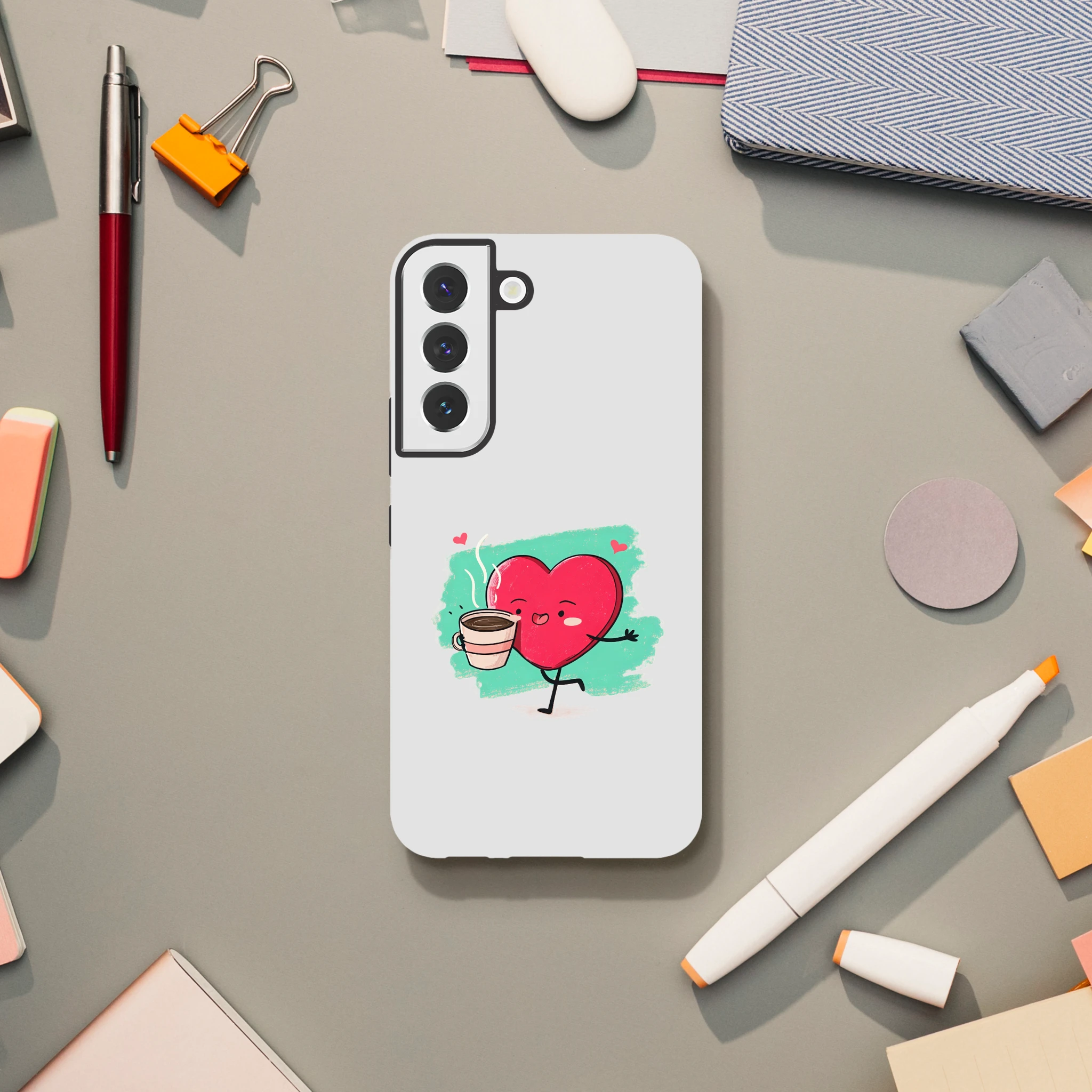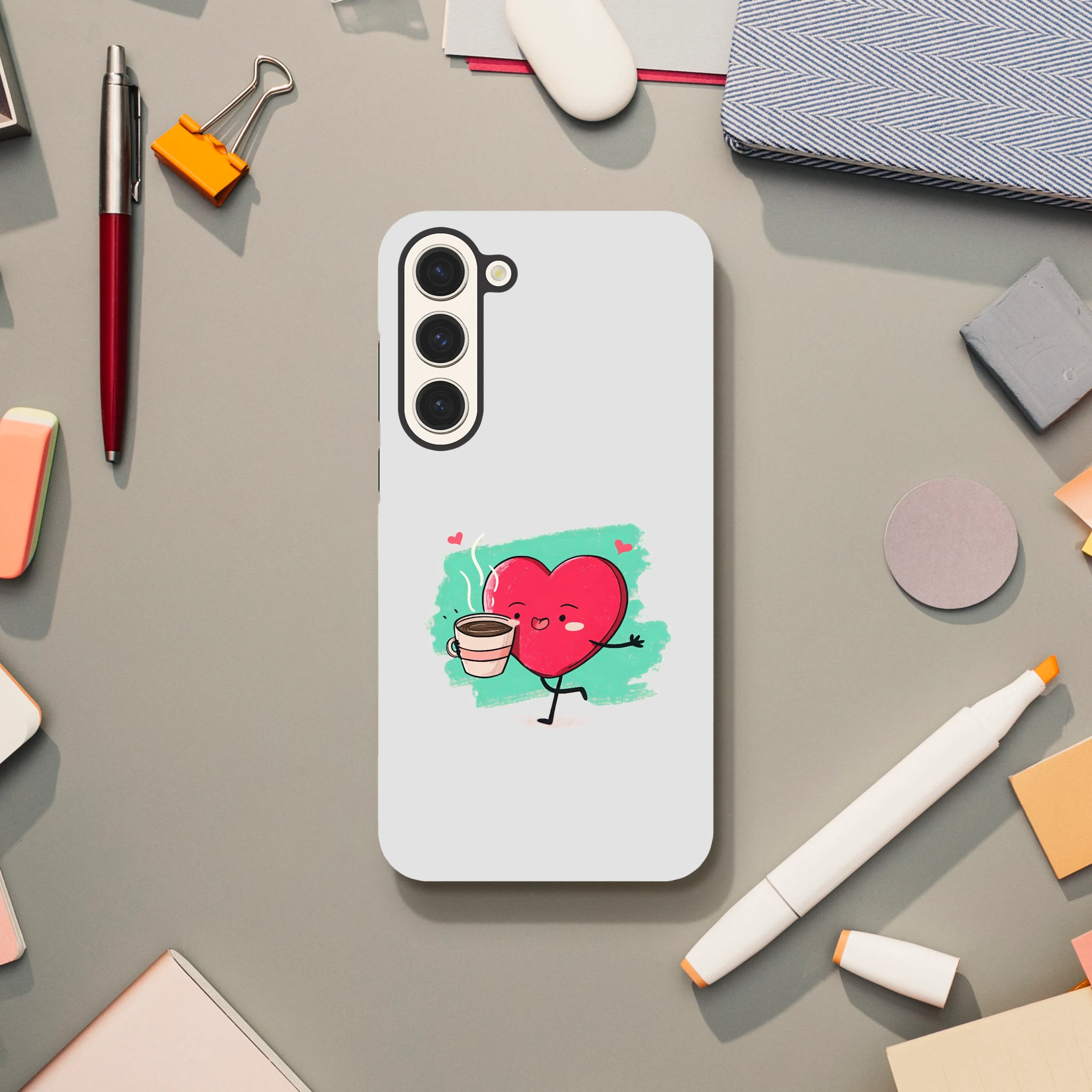 Voici la Coque de protection pour Samsung Galaxy «Cœur buvant une tasse de café» de Mimizou ! Parce que même les téléphones ont besoin de leur dose quotidienne d'amour... et de caféine ! Offrez à votre portable une protection qui ne manque pas de caractère, et surtout, d'humour. Avec ce cœur joyeux, vous serez prêt à affronter toutes les journées, même les lundis matin ! Enfilez cette coque et laissez votre téléphone savourer chaque instant. Avec Mimizou, transformez vos gadgets en véritables accros au café et fans de tendresse !