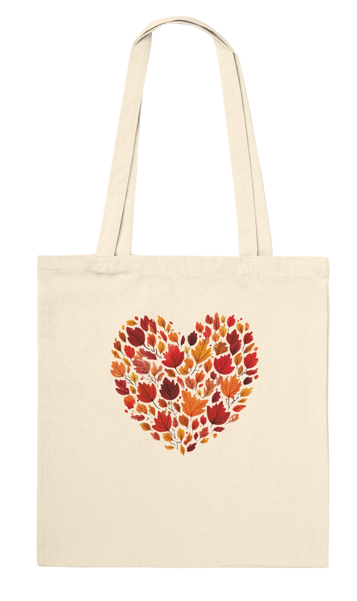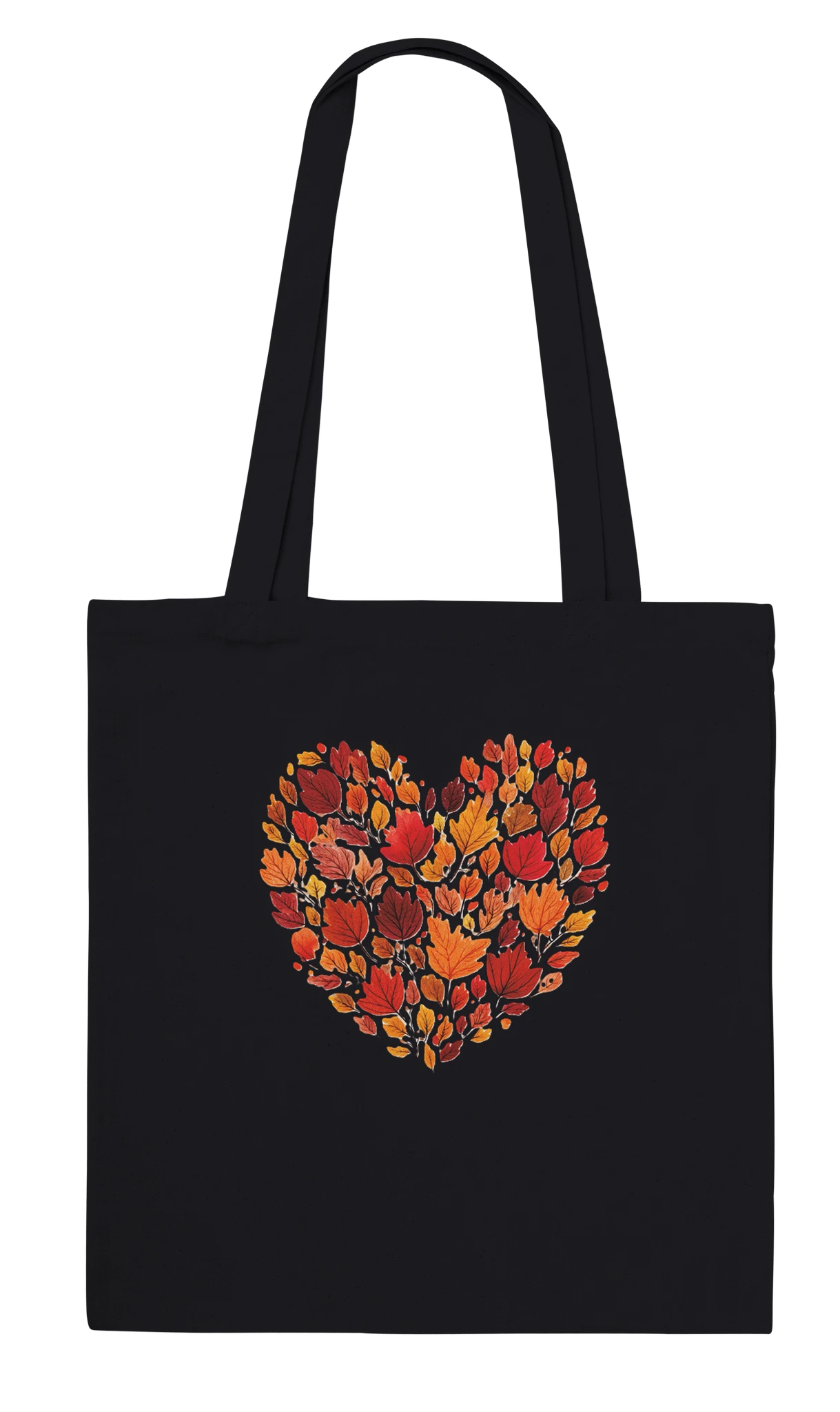 Voici le sac fourre-tout « Cœur en feuilles d’automne », l'allié parfait pour ceux qui ont un coup de foudre automnal ! Fabriqué en coton aussi doux qu’une brise d’octobre, il arbore un cœur de feuilles flamboyantes, idéal pour les amoureux de la nature... ou des tartes aux pommes ! Avec ses longues poignées, il est prêt à tout : des escapades en forêt, des virées shopping, ou même planquer une citrouille de taille respectable. Faîtes battre votre cœur pour ce sac et emportez une dose de poésie partout où vous allez !