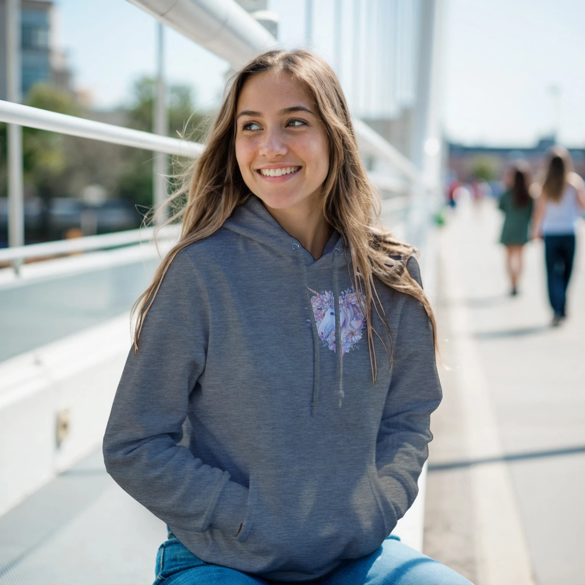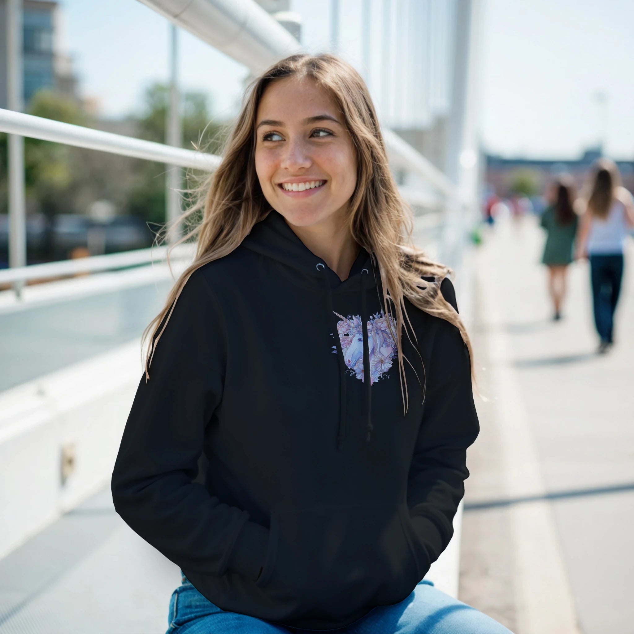 D’un coup de baguette magique (ou plutôt de licorne), voici le sweat à capuche « Couronne florale et licorne », votre nouveau partenaire pour un style enchanté ! Enfilez-le et transformez-vous en créature féerique, parce qu'une journée sans paillettes est une journée gâchée . Avec des cœurs à gogo et plus de fleurs que dans un jardin botanique, ce sweat est la rencontre entre rêve et confort . Prêt à galoper vers l’aventure ? Un must-have pour tout adepte de magie douce et de chic discret, tout comme vous l’éspériez . Attrapez-le avant qu’il ne galope hors du stock !