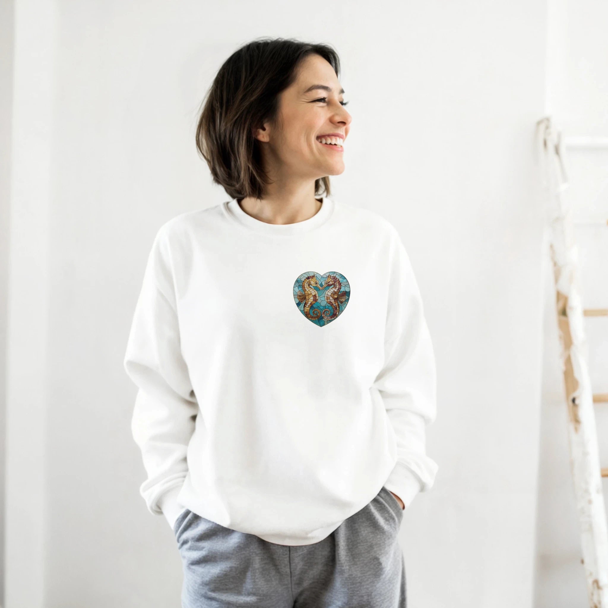 Découvrez le sweat sans capuche «Deux hippocampes» de Mimizou, où l’amour marin prend vie ! Avec nos deux petits chevaux des mers, prêts à valser dans les vagues de votre quotidien, portez une touche d'océan tout en restant bien au sec . Et pour ceux qui hésitent encore : rappelez-vous, les hippocampes mâles portent les bébés . Alors, qui a dit que vous ne pouviez pas aussi porter l'amour sur vos épaules ? Adoptez un style unique qui fera chavirer les cœurs et les océans. Plongez dans l'élégance et laissez-vous envoûter par ces motifs envoûtants !