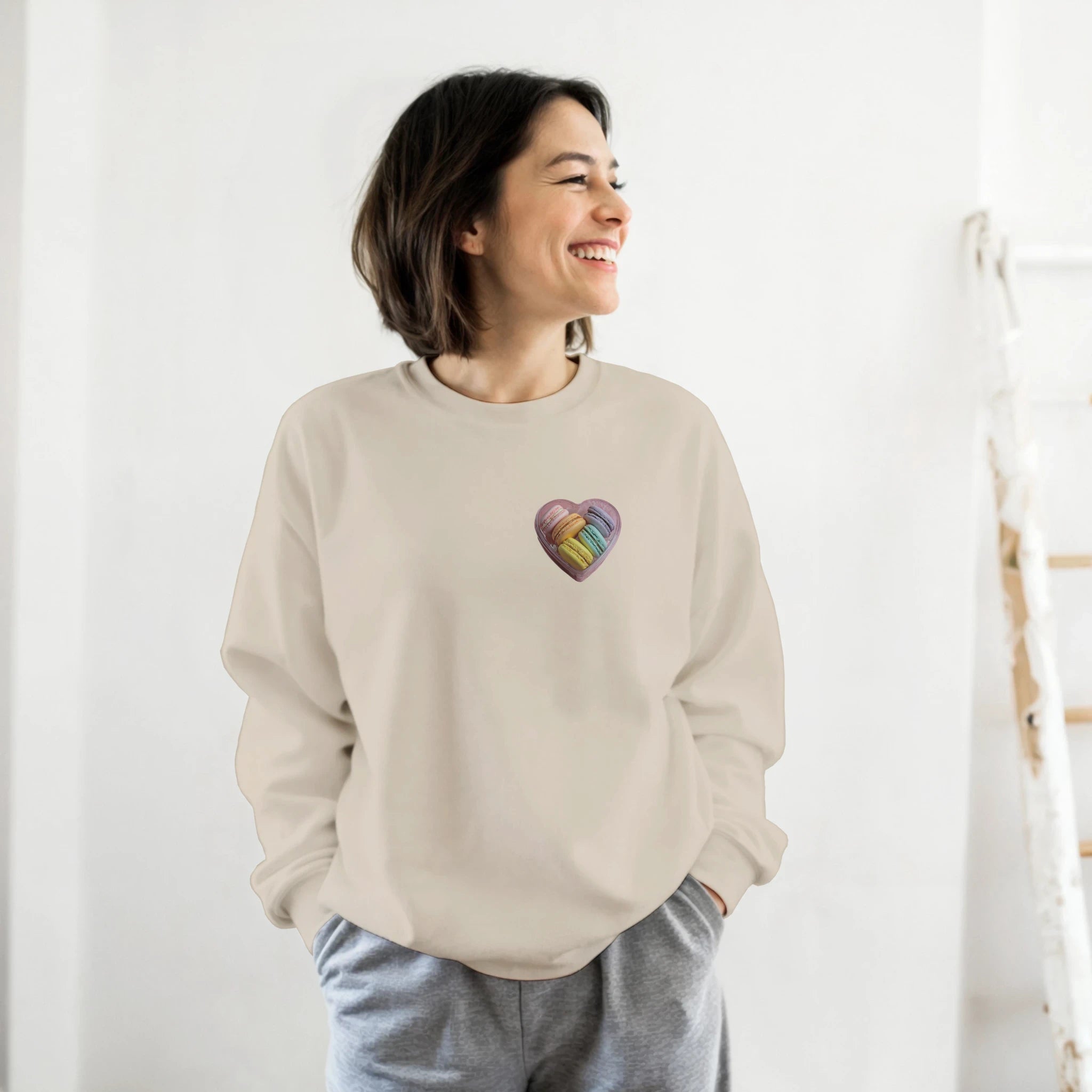 Faites fondre les cœurs avec notre nouveau sweat sans capuche «Macarons» ! Orné d’une boîte en forme de cœur débordante de macarons colorés, ce sweat est l'arme secrète pour ajouter une touche de douceur à votre quotidien. Parfait pour les gourmands qui veulent afficher leur amour sucré, sans les calories ! Enfilez-le et laissez les compliments pleuvoir comme des éclats de chocolat. À chaque coup d'œil dans le miroir, un sourire garanti. Il paraît même que Cupidon lui-même en a commandé un ! Alors, prêts à croquer la mode à pleines dents ?