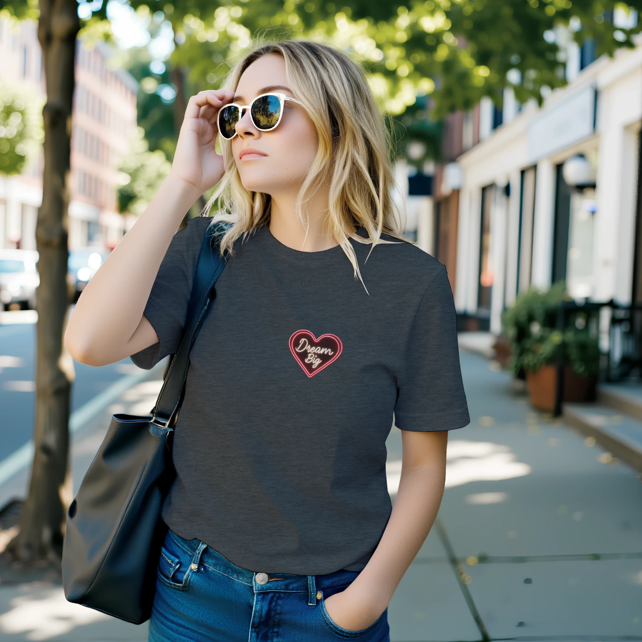 Visez les étoiles avec notre T-shirt unisexe « Dream Big » en néon ! Un cœur aussi lumineux que votre imagination vous rappellera que même vos rêves de chaussettes volantes sont valables. Avec ce t-shirt, passez des messages subtilement scintillants à vos amis et collègues : rêver grand, c'est être ambitieux, mais aussi se souvenir que la pizza du vendredi est sacrée. Enfilez ce bijou de coton, et laissez la magie commencer ! Attention, effet secondaire possible : une augmentation soudaine de compliments et d’envie de danser sous les étoiles. Rêvez grand, brillez plus !
